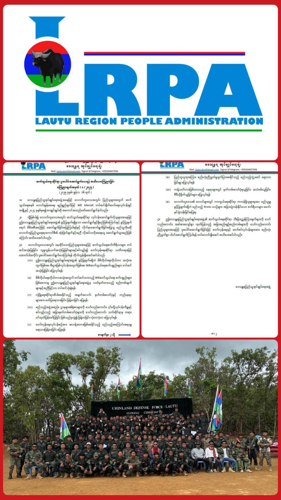 လောက်တူနယ်ဒေသတွင် ဒေသန္တရပြည်သူ့အုပ်ချုပ်ရေးအဖွဲ့၏ ဆက်သွယ်ရေးဆိုင်ရာ သီးခြားညွှန်ကြားချက်များ၊ အခါအားလျော်စွာ ထုတ်ပြန်သည့် အခြားစည်းမျဉ်းစည်းကမ်းများကို ပြည်သူများအနေဖြင့် ပူးပေါင်းဆောင်ရွက်ခြင်းဖြင့် တော်လှန်ရေးနှင့် ဆက်စပ်လုပ်ငန်းများအား စည်းလုံးညီညွတ်စွာ ပါဝင်ဆောင်ရွက်ကြပါရန် လောက်တူနယ်ဒေသ ပြည်သူ့အုပ်ချုပ်ရေးအဖွဲ့ ( Lautu Region People Administration – LRPA) က အသိပေးထားသည်ကို သိရသည်။