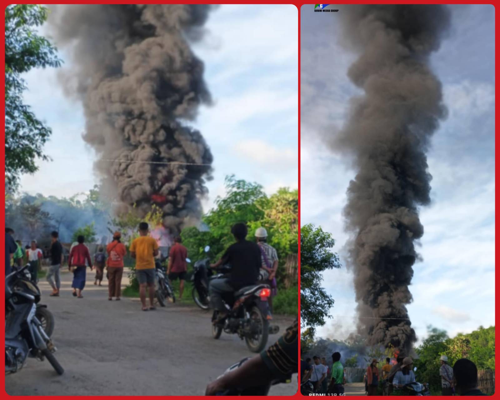 ပုံစာ – လေကြောင်းတိုက်ခိုက်မှုကြောင့် ဓာတ်ဆီသိုလှောင်ရုံ မီးလောင်နေသည်ကိုတွေ့ရစဉ်။