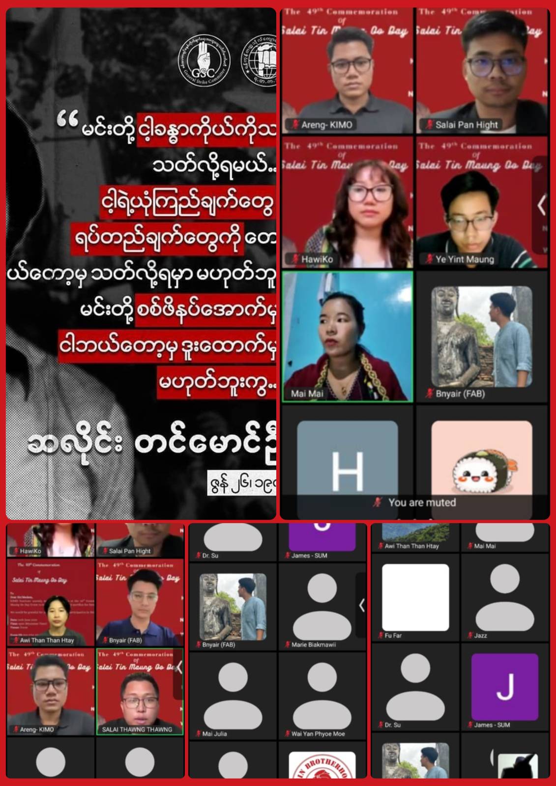 Kimo Instiute က ဦးဆောင်ကျင်းပသည့် ၄၉ နှစ်မြောက် အာဇာနည် ကျောင်းသားခေါင်းဆောင် ဆလိုင်းတင်မောင်ဦးနေ့ အခမ်းအနားကို အွန်လိုင်းZoomဖြင့် ယနေ့ ဇွန်လ ၂၆ ရက်နေ့ ညနေ ၆နာရီ မှ ည ၉ နာရီအထိ ကျင်းပခဲ့ကြောင်း သိရသည်။