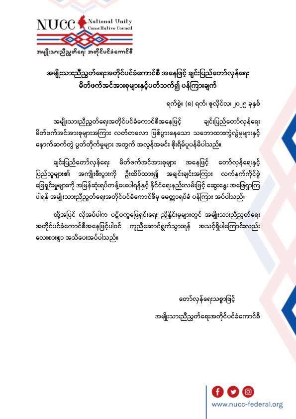 ထို့အပြင် လိုအပ်ပါက ပဋိပက္ခဖြေရှင်းရေး ညှိနှိုင်းမှုများတွင် အမျိုးသားညီညွတ်ရေး အတိုင်ပင်ခံကောင်စီ အနေဖြင့် ပါဝင်ကူညီဆောင်ရွက်သွားရန် အသင့်ရှိပါကြောင်း NUCC က အသိပေးထုတ်ပြန်ထားသည်။