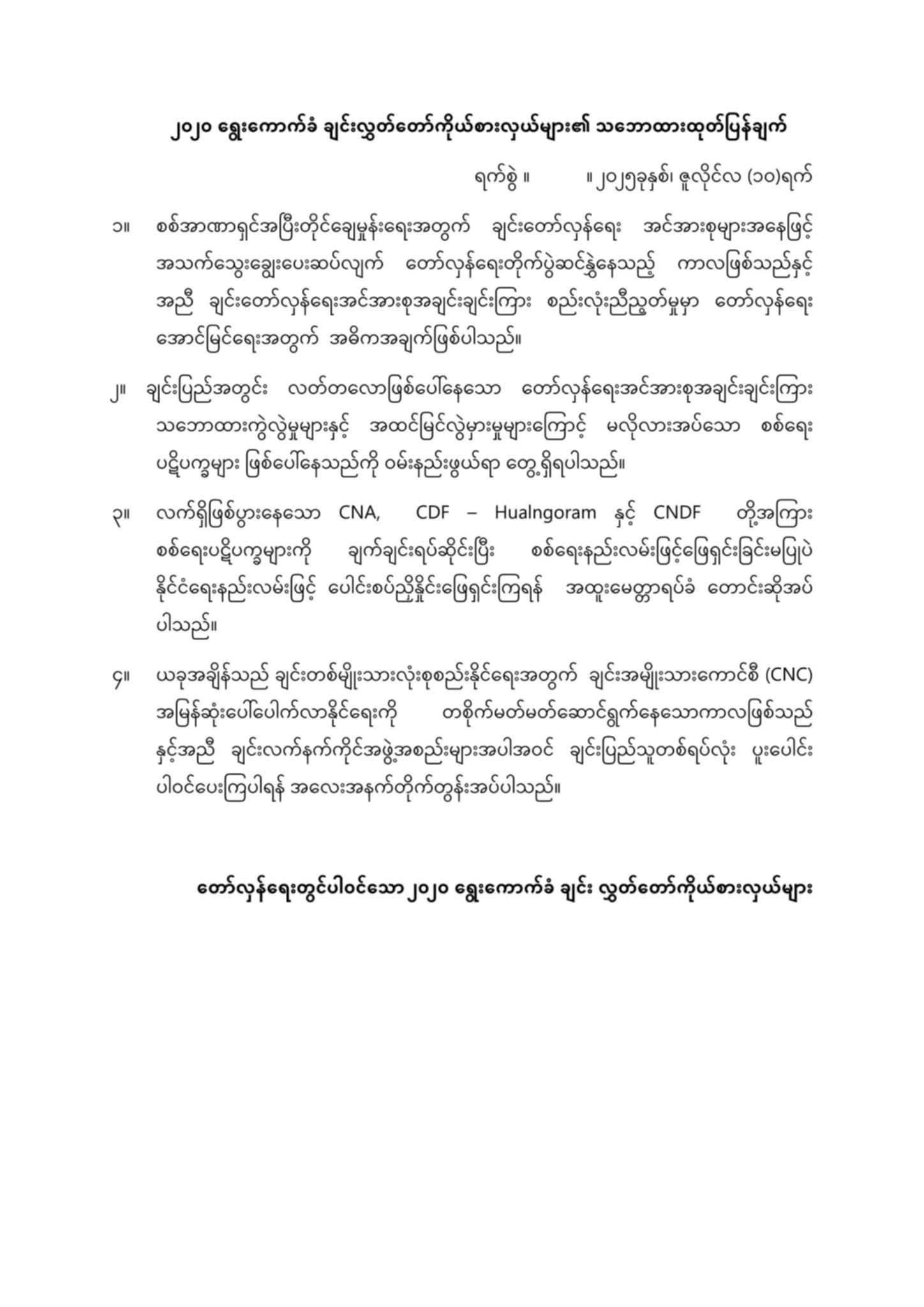 ချင်းပြည်အတွင်း CNA ၊ CDF – Hualngoram နှင့် CNDF တို့အကြား ဖြစ်ပေါ်နေသော စစ်ရေးပဋိပက္ခများ ချက်ချင်းရပ်ဆိုင်းပြီး နိုင်ငံရေးနည်းလမ်းဖြင့် ပေါင်းစပ်ညှိနှိုင်းဖြေရှင်းကြရန် ၂၀၂၀ ရွေးကောက်ခံ ချင်းလွှတ်တော်ကိုယ်စားလှယ်များက ဇူလိုင်လ ၁၀ ရက်နေ့တွင် တိုက်တွန်းချက် ထုတ်ပြန်ထားသည်ကို သိရသည်။