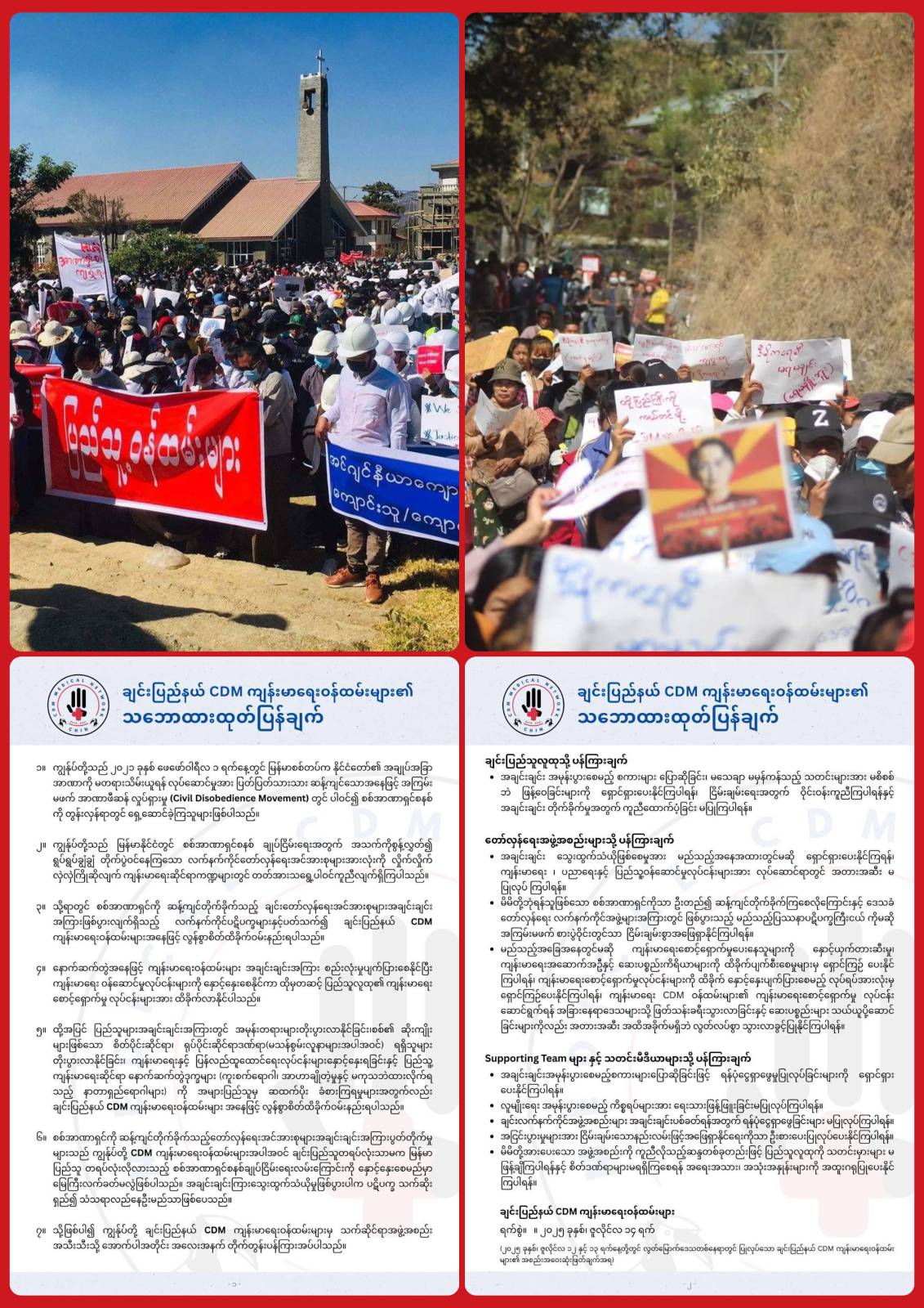 အငြင်းပွားမှုများအား ငြိမ်းချမ်းသောနည်းလမ်းဖြင့် အဖြေရှာနိုင်ရေးကိုသာ ဦးစားပေးပြုလုပ်ပေးနိုင်ကြပါရန်။ မိမိတို့အားပေးသော အဖွဲ့အစည်းကို ကူညီလိုသည့်ဆန္ဒတစ်ခုတည်းဖြင့် ပြည်သူလူထုကို သတင်းမှားများ မဖြန့်ချိကြပါရန်နှင့် စိတ်ဒဏ်ရာများမရရှိကြစေရန် အရေးအသား၊ အသုံးအနှုန်းများကို အထူးဂရုပြုပေးနိုင်ကြ ပါရန် ချင်းပြည်နယ် CDM ကျန်းမာရေးဝန်ထမ်းများ ကထုတ်ပြန်ထားသည်။