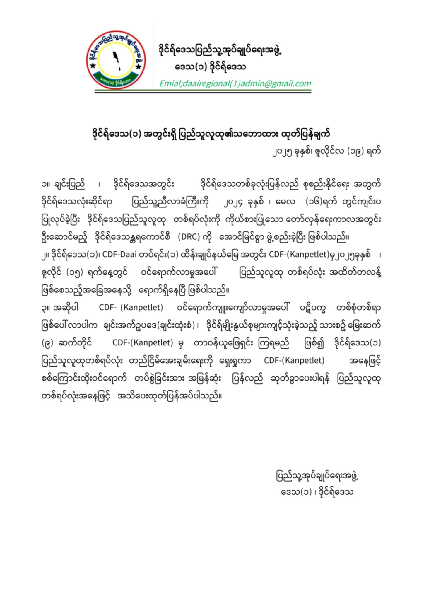 ဒိုင်ရ်ဒေသ(၁) ပြည်သူလူထုတစ်ရပ်လုံး တည်ငြိမ်ရေးချမ်းရေးကို ရှေးရှုက၍ CDF-Kanpetlet အနေဖြင့် စစ်ကြောင်းထိုး ဝင်ရောက်တပ်စွဲခြင်းအား အမြန်ဆုံး ပြန်လည်ဆုတ်ခွာပေးရန် ပြန်သူလူထုတစ်ရပ်လုံးအနေဖြင့် ဒိုင်ရ်ဒေသ-၁ ပြည်သူ့အုပ်ချုပ်ရေးအဖွဲ့က ထုတ်ပြန်ထားသည်။