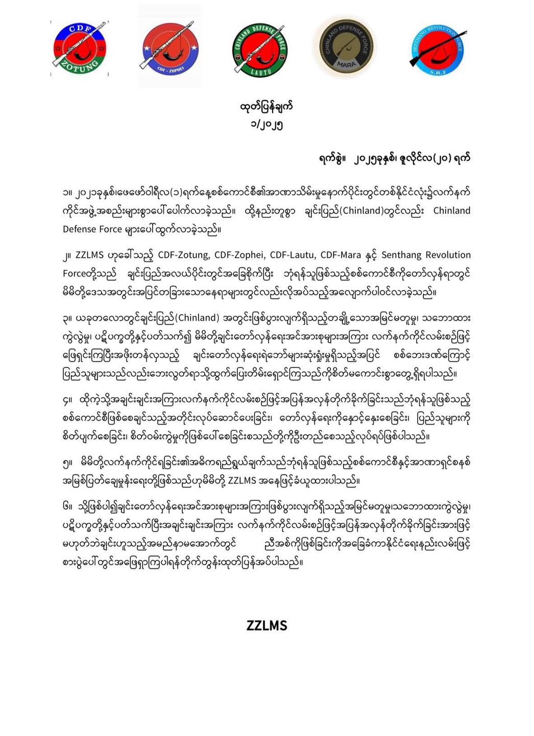 ZZLMS အဖွဲ့သည် ချင်းပြည်အလယ်ပိုင်းတွင် အခြေစိုက်ပြီး ဘုံရန်သူဖြစ်သည့် စစ်ကောင်စီကို တော်လှန်ရာတွင် မိမိတို့ဒေသအပြင် တခြားသော နေရာများတွင်လည်း လိုအပ်သည့်အလျောက် ပါဝင်နေကြောင်း ထုတ်ပြန်ချက်တွင် ဖော်ပြထားသည်။