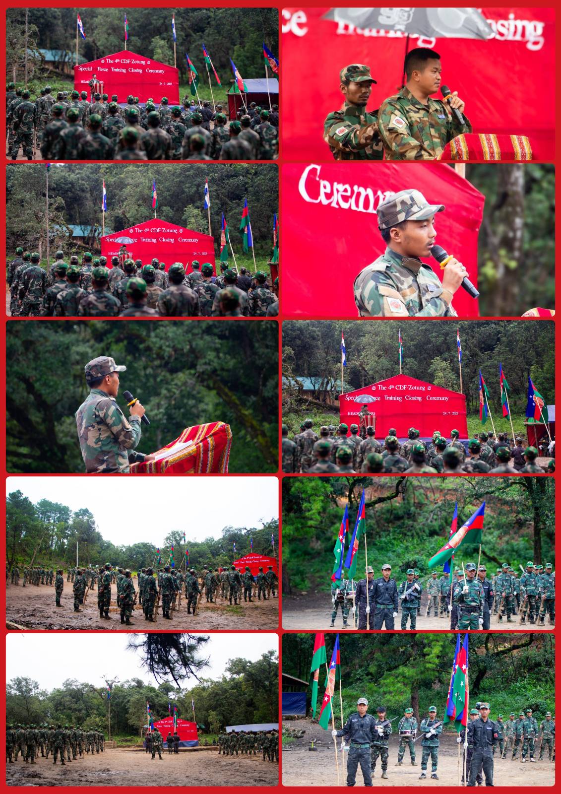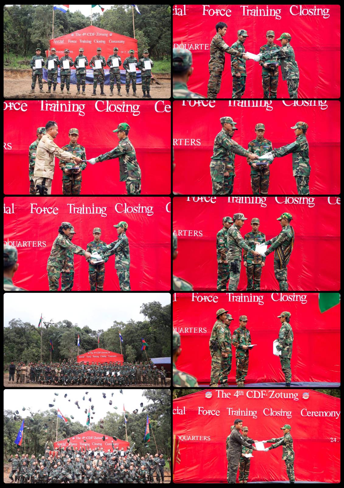 CDF-ZOTUNG မှ ဦးစီးကျင်းပသည့် (၄) ကြိမ်မြောက် Special Force Training ပြီးစီးမှုနှင့် ရဲဘော်သစ်များအား ဆုပေးခြင်း၊ ဆုတောင်းပေးခြင်း အခမ်းအနားကို ဇူလိုင်လ ၂၄ ရက်နေ့တွင် ဇိုတုန်ဒေသတစ်နေရာ၌ အောင်မြင်စွာ ကျင်းပပြုလုပ်နိုင်ခဲ့ကြောင်း CDF-ZOTUNG က ထုတ်ပြန်ထားသည်ကို သိရသည်။