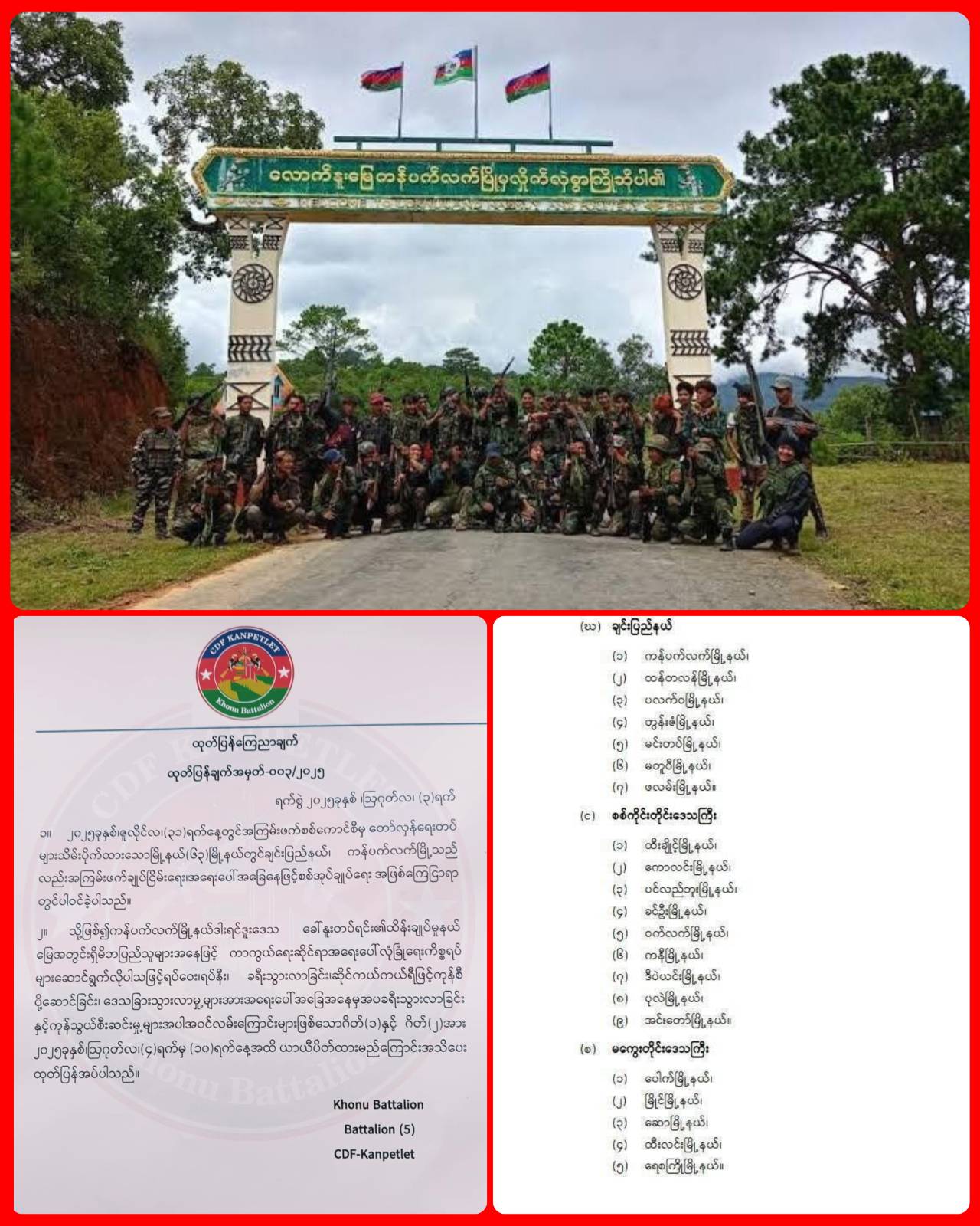 ချင်းပြည်၊ ကန်ပက်လက်မြို့နယ်အား စစ်ကောင်စီက အရေးပေါ်အခြေအနေကြေညာခြင်းကြောင့် ဒါးရင်ဒူးဒေသ ခေါ်နူးတပ်ရင်း၏ ထိန်းချုပ်မှုနယ်မြေအတွင်းရှိ ဂိတ်တချို့ကို ယာယီပိတ်ထားမည်ဖြစ်ကြောင်း ယနေ့ ဩဂုတ်လ ၂ ရက်နေ့တွင် CDF – Kanpetlet, Battalion (5), Khonu Battalion က ထုတ်ပြန်ထားသည်။
