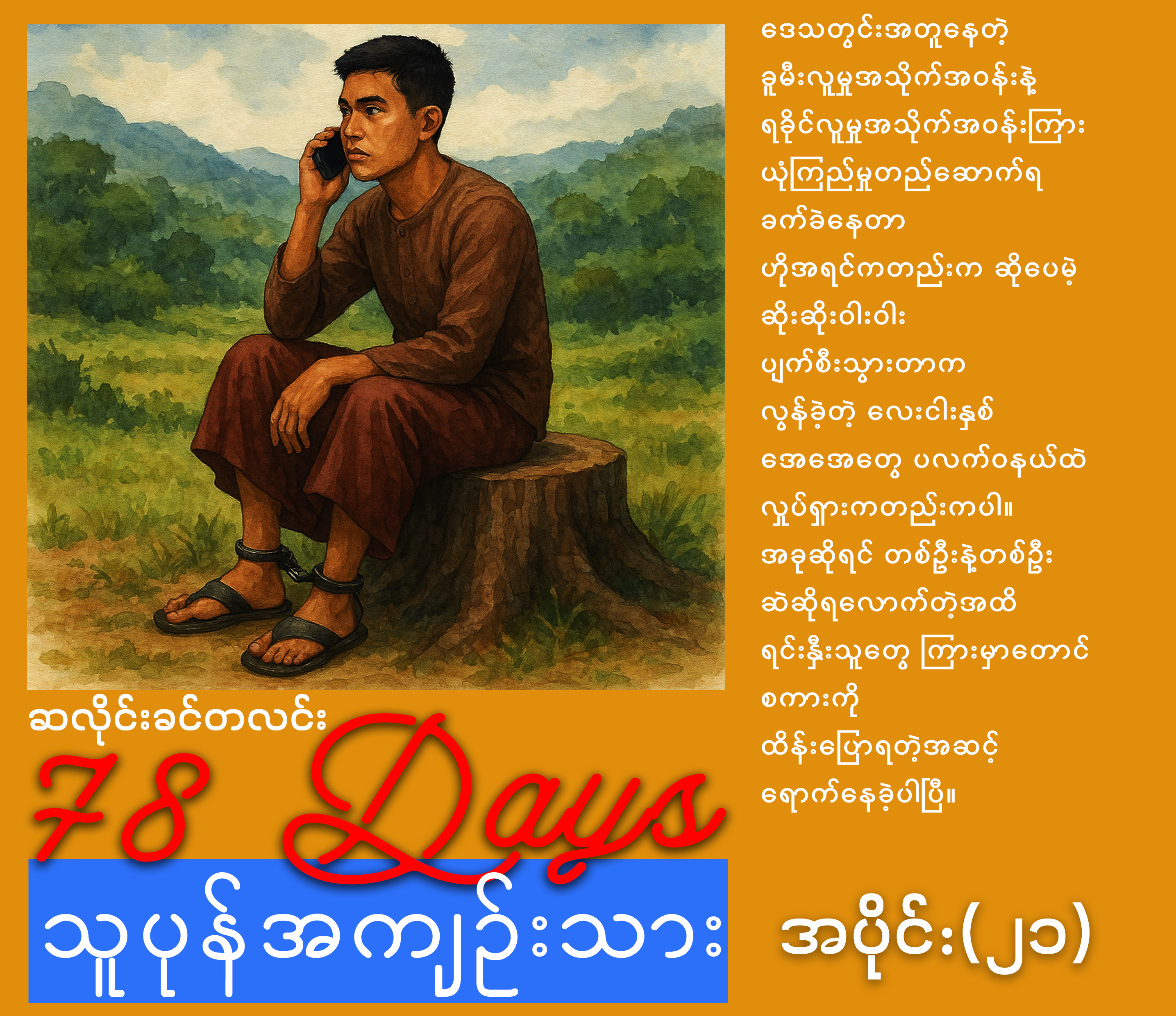 ဖုန်းစကားပြောတာ ရပ်လိုက်ပါတယ်။ လေးလံတဲ့ခြေလှမ်းတွေနဲ့ တဲဆီပြန်လာပါတယ်။ ပြီးတော့ ခြေပစ်လက်ပစ် နားနေလိုက်ပါတယ်။ ကျွန်တော် စတင်အဖမ်းဆီးခံရတဲ့ နေ့ရဲ့ခံစားချက်မျိုး ဝင်လာပါတယ်။