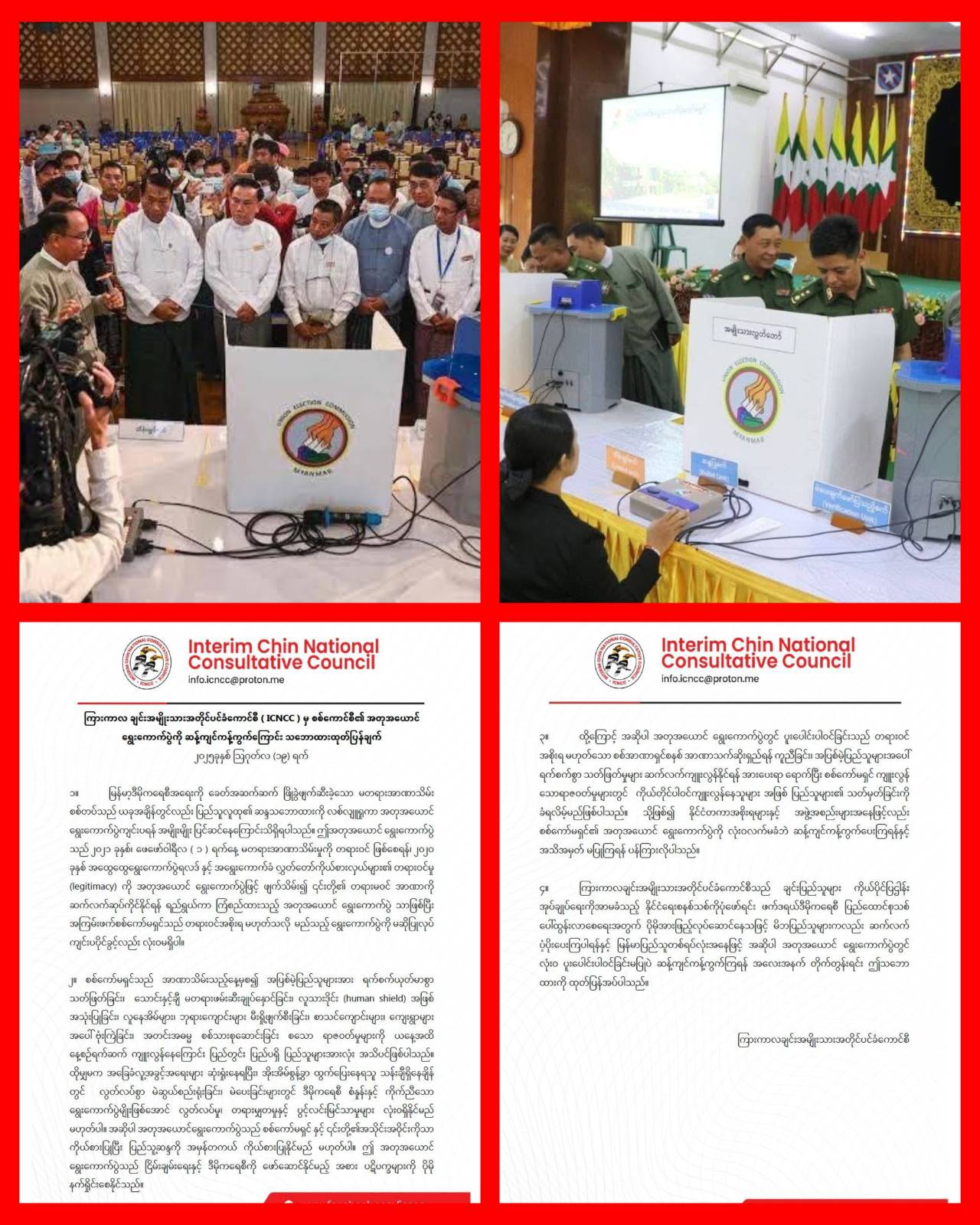 မတရား အာဏာသိမ်း စစ်ကောင်စီ၏ အတုအယောင် ရွေးကောက်ပွဲတွင် လုံးဝပူးပေါင်းပါဝင်ခြင်းမပြုပဲ ဆန့်ကျင်ကန့်ကွက်ကြရန် ကြားကာလ ချင်းအမျိုးသားအတိုင်ပင်ခံကောင်စီ (ICNCC) က ဩဂုတ်လ ၁၉ ရက်နေ့တွင် ထုတ်ပြန်ထားသည်။