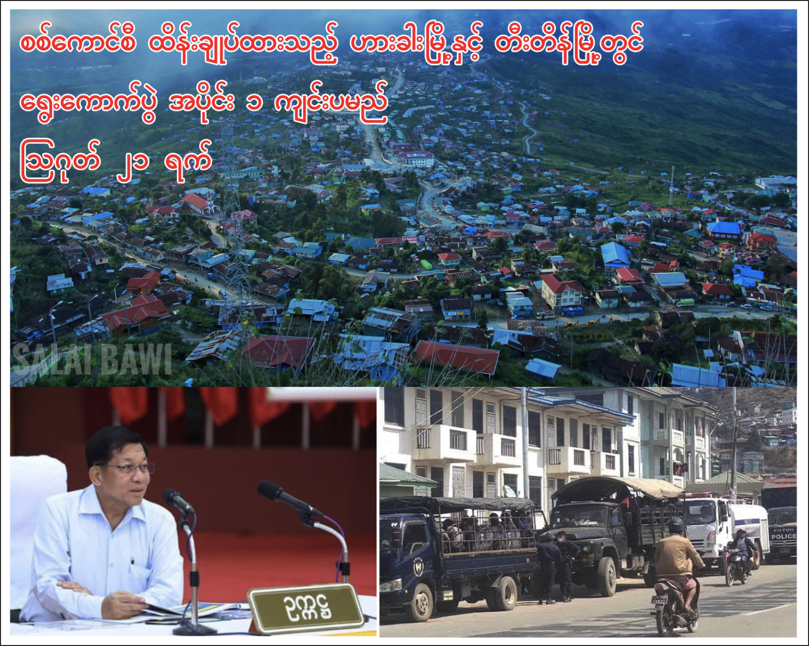 ချင်းပြည်နယ်၊ ဟားခါးမြို့ နှင့် တီးတိန်မြို့တွင် ရွေးကောက်ပွဲ အပိုင်း (၁) ကျင်းပသွားမည်ဖြစ်ကြောင်း စစ်ကောင်စီက ယမန်နေ့ သြဂုတ် ၂၀ ရက်နေ့တွင် ထုတ်ပြန်သည်။ လာမည့် ဒီဇင်ဘာ ၂၈ ရက်နေ့တွင် ဟားခါးနှင့် တီးတိန်မြို့အပါအဝင် တိုင်းနှင့် ပြည်နယ်ရှိ ၁၀၂ မြို့နယ်တွင် ရွေးကောက်ပွဲ အပိုင်း (၁) ကျင်းပ သွားမည်ဖြစ်သည်။ ချင်းနှင့် ကယားတွင် ၂ မြို့နယ်၊ ရခိုင်နှင့် ကရင်တွင် ၃ မြို့နယ်၊ ကချင်တွင် ၆ မြို့နယ်၊ မန္တလေးတွင် ၈ မြို့နယ်၊ စစ်ကိုင်းတွင် ၁၂ မြို့နယ်၊ ပဲခူးတွင် ၈ မြို့နယ်တို့တွင် အပိုင်း (၁) ရွေးကောက်ပွဲ ကျင်းပမည်ဖြစ်သည်။ ထို့အပြင် ရန်ကုန်တွင် ၁၂ မြို့နယ်၊ ဧရာဝတီတွင် ၈မြို့နယ်၊ ရှမ်းတွင် ၁၂ မြို့နယ်၊ မွန်တွင် ၅မြို့နယ်၊ မကွေးတွင် ၉ မြို့နယ်နှင့် တနင်္သါရီတွင် ၄ မြို့နယ်တို့လည်း ပါဝင်သည်။ ချင်းပြည်နယ်ရှိ မြို့နယ်အားလုံးတွင် လာမည့် ရွေးကောက်ပွဲ ကျင်းပသွားမည်ဟု စစ်ကောင်စီက ကြေညာထားသော်လည်း ၎င်းတို့ထိန်းချုပ်ထားသည့် ဟားခါးနှင့် တီးတိန်မြို့တွင် အပိုင်း (၁) အနေဖြင့် အရင်ဆုံး ကျင်းပမည်ဖြစ်သည်။ ထိုရွေးကောက်ပွဲတွင် ချင်းပြည်နယ်၏ ကိုယ်စားပြု ချင်းပါတီများဖြစ်သည့် ခူမီးအမျိုးသားပါတီ (KNP)၊ ချင်းပြည်သစ်ကွန်ဂရက်ပါတီ (NCC) နှင့် ဇိုမီးအမျိုးသားပါတီ (ZNP) တို့က ဝင်ရောက် ယှဥ်ပြိုင်သွားမည် ဖြစ်သည်။ ချင်းပြည်နယ်တွင် ဟားခါးနှင့် တီးတိန်မြို့ နှစ်ခုသာ စစ်ကောင်စီထိန်းချုပ်နိုင်ပြီး တီးတိန်မြို့တွင် ကျင်းပမည့် ရွေးကောက်ပွဲကို ပြည်သူလူထုနှင့်အတူ ဆန့်ကျင်တားဆီးသွားမည်ဖြစ်ကြောင်း PDF-Zoland က ထုတ်ပြန်ထားသည်။