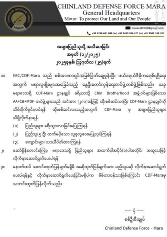 မရာဒေသက CDF-Mara ဌာနချုပ် ဧရိယာသို့ Chin Brotherhood အဖွဲ့ဝင်တွေဖြစ်ကြသည့် MDF၊ AA နှင့် CB တပ်ဖွဲ့ များသည် အင်အား ၂၀၀ ခန့်ဖြင့် ထိုးစစ်ဆင်လာကာ CDF-Mara ဌာနချုပ်ကို သိမ်းပိုက်ရှင်းလင်းရန် ထိုးစစ်ဆင်လာ​ကြောင်း CDF-Mara က ဆိုသည်။