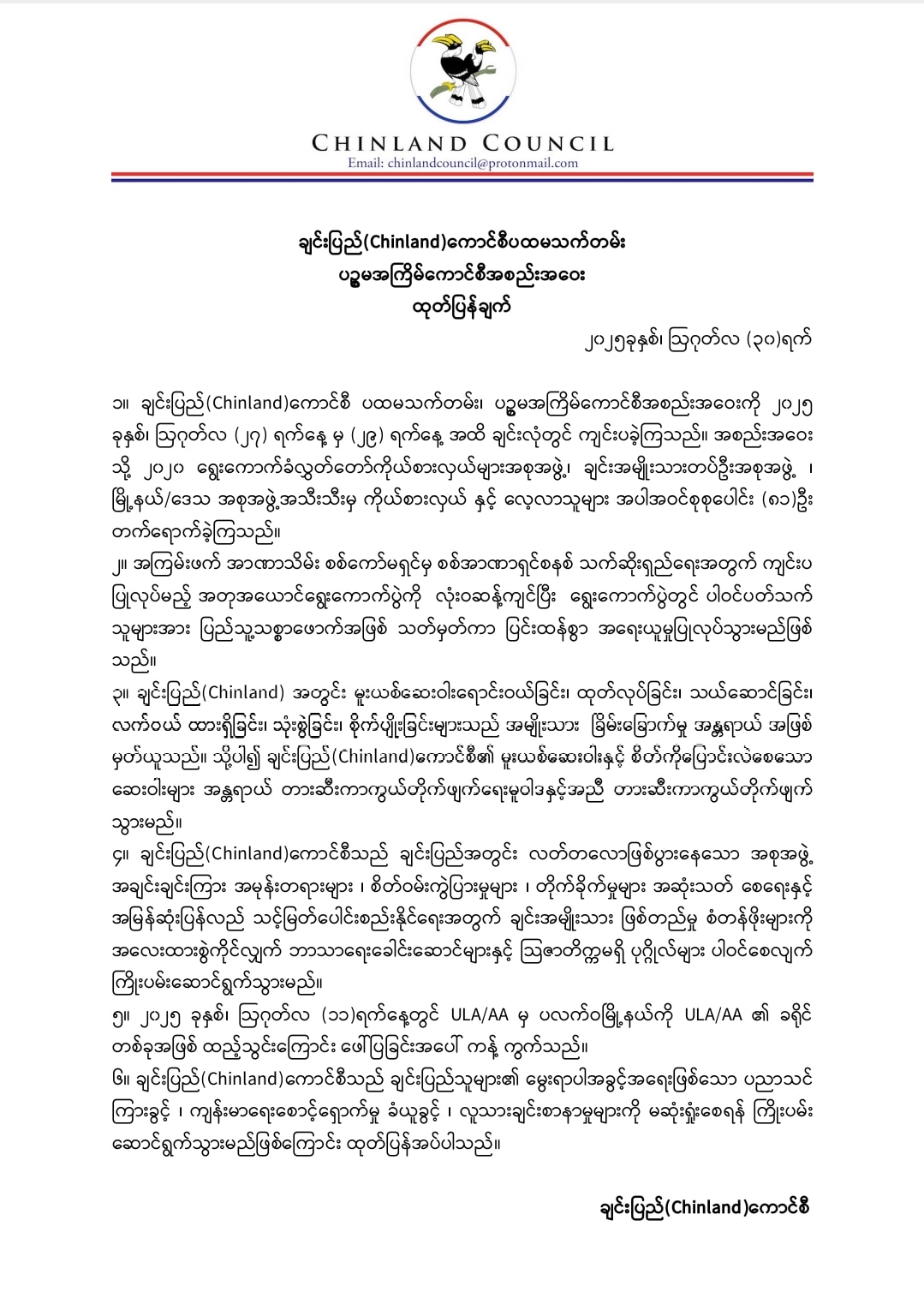 ချင်းပြည်သူများ၏ မွေးရာပါအခွင့်အရေးဖြစ်သော ပညာသင်ကြားခွင့်၊ ကျန်းမာရေး စောင့်ရှောက်မှု ခံယူခွင့်၊ လူသားချင်းစာနာမှုများကို မဆုံးရှုံးစေရန် ကြိုးပမ်းဆောင်ရွက်သွားမည်ဖြစ်ကြောင်း ချင်းပြည်(Chinland) ကောင်စီက ထုတ်ပြန်ထားသည်။