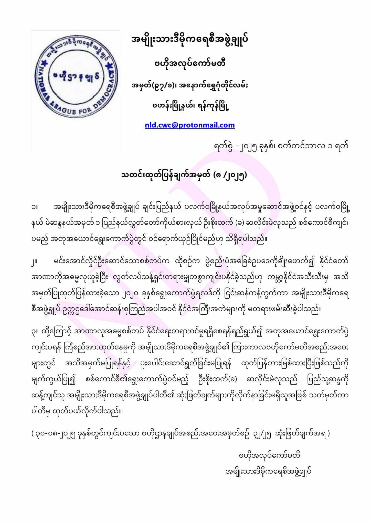 စစ်ကောင်စီ၏ ရွေးကောက်ပွဲဝင်မည့် ဦးစိုးထက်(ခ) ဆလိုင်းမဲလုကို NLD ပါတီမှ ထုတ်ပယ်