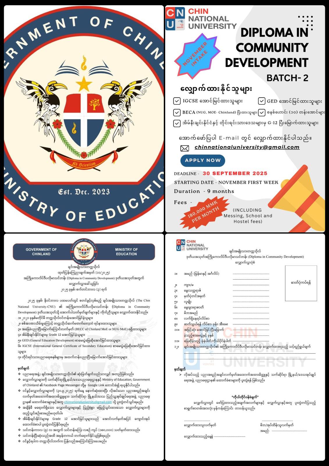 လျှောက်လွှာများကို သက်ဆိုင်ရာမြို့နယ်/ဒေသပညာရေးဌာနနှင့် Ministry of Education, Government of Chinland ၏ Facebook Page Messenger တို့မှ Google Link တောင်းခံ၍ ရယူနိုင်ကြောင်းနှင့် ပညာရေးအဖွဲ့၊ ချင်းအမျိုးသားတက္ကသိုလ်၏ ဆုံးဖြတ်ချက်သည်သာလျှင် အတည်ဖြစ်ကြောင်း သိရသည်။