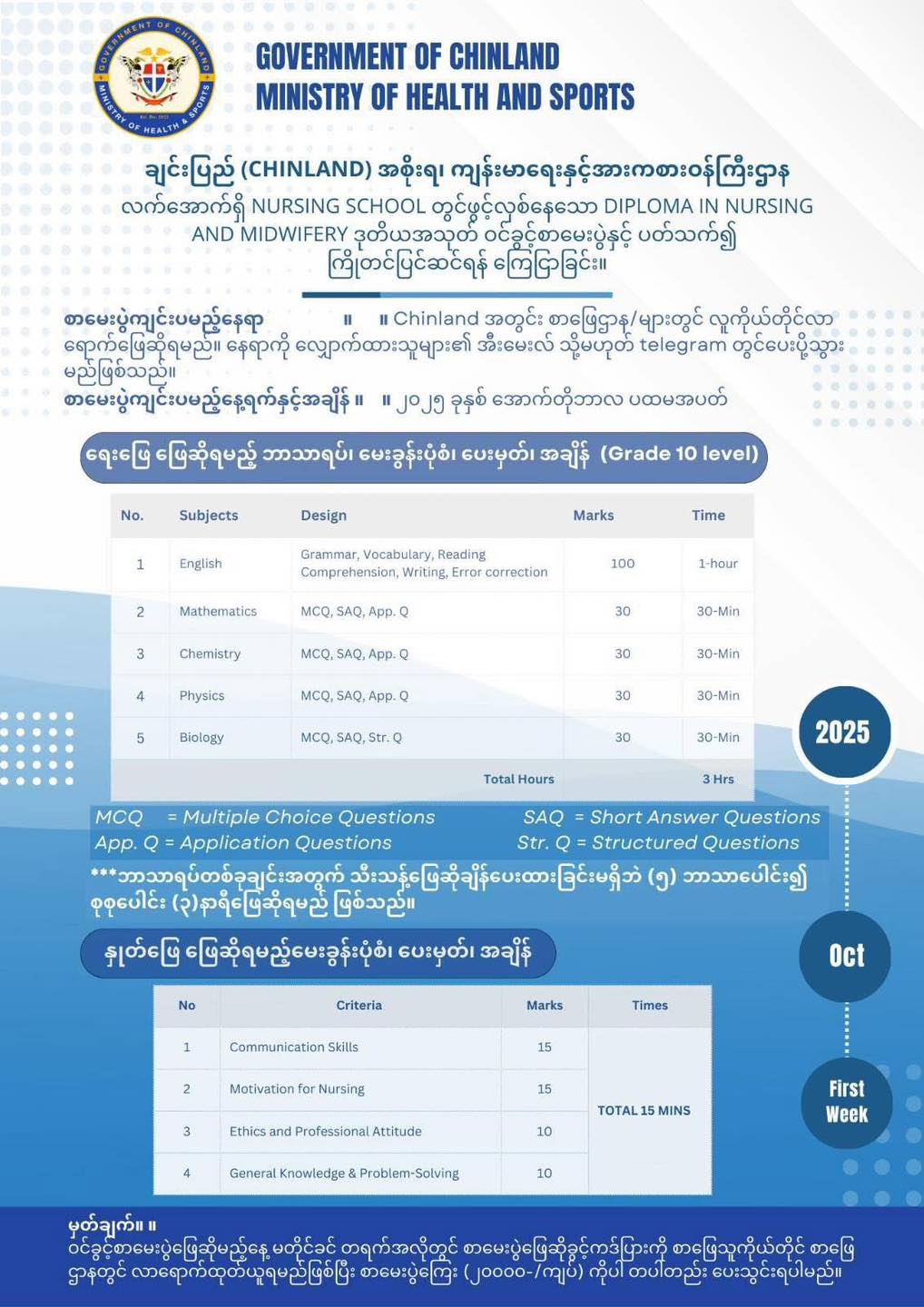Diploma in Nursing and Midwifery ဒုတိယအသုတ် ဝင်ခွင့်စာမေးပွဲနှင့်ပတ်သက်၍ ကြိုတင်ပြင်ဆင်ရန် ချင်းပြည်(Chinland) အစိုးရ၊ ကျန်းမာရေးနှင့် အားကစားဝန်ကြီးဌာနမှ အသိပေး