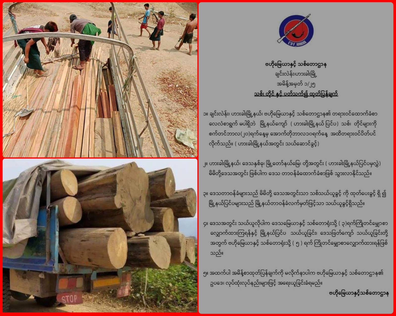 ချင်းပြည်၊ ဟားခါးမြို့နယ်ပြင်ပနှင့် ဟားခါးမြို့နယ်အတွင်း သစ်၊ တိုင်များ သယ်ယူခွင့်ကို ဗဟိုမြေယာနှင့် သစ်တောဌာန၏ သက်ဆိုင်ရာမှ တရားဝင်ထောက်ခံစာဖြင့်သာ သယ်ယူခွင့်ပြုကြောင်း CDF-Hakha က ထုတ်ပြန်ထားသည်။