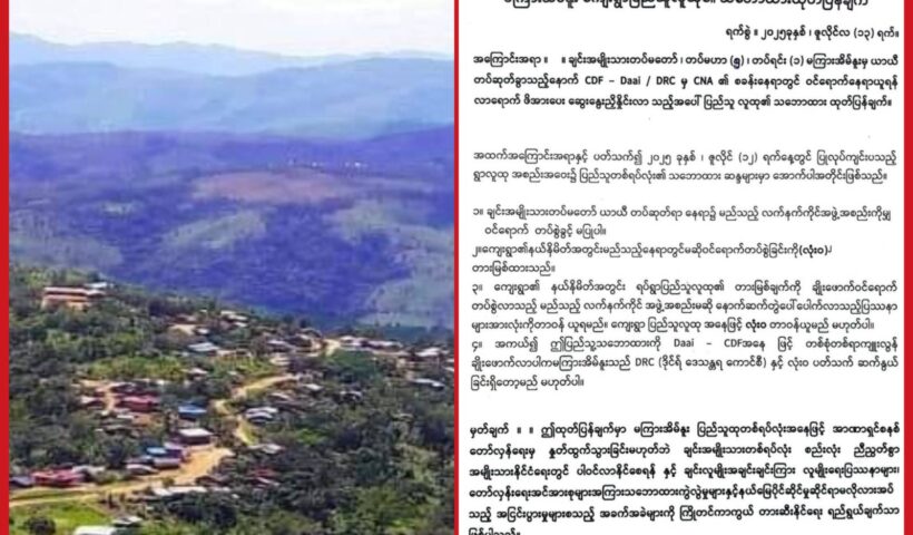 မကြားအိမ်နူးကျေးရွာဘက်သို့ စစ်ကြောင်းထိုးဝင်ရောက်လာသည့် CDF-Kanpetlet ကို ပြန်လည်ဆုတ်ခွာရန် DRC က အသိပေး ထုတ်ပြန်