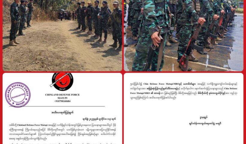 CDF-Matupi/MRO နှင့် မဟာမိတ်များအား ကျူးကျော်တပ်စခန်းများကို အမြန်ဆုံး ရုပ်သိမ်းပေးရန် CDF-Matupi (တပ်မဟာ-၂) အသိပေး ဇူလိုင်လ ၁၄ ရက်၊ ၂၀၂၅။ ချင်းပြည်၊ မတူပီမြို့နယ်အတွင်း CDF-Matupi/MRO နှင့် မဟာမိတ်များ အနေဖြင့် ကျူးကျော်တပ်စခန်းများ၊ တပ်ဖွဲ့ဝင်များအား အမြန်ဆုံး ပြန်လည်ရုတ်သိမ်းပေးရန်နှင့် မိမိကိုယ်ကိုခုခံပိုင်ခွင့်အား ကျင့်သုံးသွားမည်…