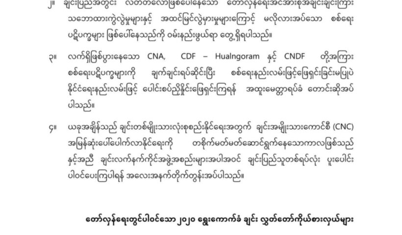 CNA ၊ CDF – Hualngoram နှင့် CNDF တို့အကြား စစ်ရေးပဋိပက္ခများ ချက်ချင်းရပ်ဆိုင်းပြီး နိုင်ငံရေးနည်းလမ်းဖြင့် ပေါင်းစပ်ညှိနှိုင်းဖြေရှင်းကြရန် ချင်းလွှတ်တော်ကိုယ်စားလှယ်များ တိုက်တွန်း ဇူလိုင်လ ၁၁ ရက်၊ ၂၀၂၅။ ချင်းပြည်အတွင်း CNA ၊ CDF – Hualngoram နှင့်…