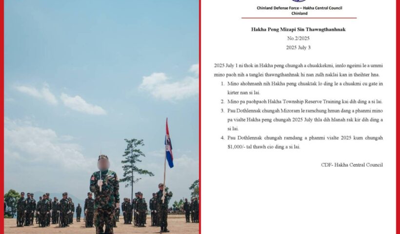 ဟားခါးမြို့နယ်အတွင်းရှိ လိုက်နာရမည့်အရာများကို CDF- Hakha Central Council က ထုတ်ပြန် ဇူလိုင်လ ၄ ရက်၊ ၂၀၂၅။ ချင်းပြည်၊ ဟားခါးမြို့နယ်တွင် မွေးဖွားသူ၊ နေအိမ်အခြေအတည်နေထိုင်သည့် လူငယ်များအလုံး ၂၀၂၅ ခုနှစ်၊ ဇူလိုင်လ ၁ ရက်နေ့မှစ၍ လိုက်နာရမည့်အရာများကို CDF –…