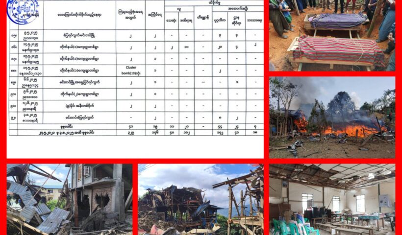 မင်းတပ်မြို့နယ်တွင် အာဏာသိမ်း ငါးနှစ်တာကာလအတွင်း လေကြောင်းတိုက်ခိုက်မှုကြောင့် အရပ်သား ၄၀ ဦး သေဆုံးပြီး ၁၂၀ ဦး ထိခိုက်ဒဏ်ရာရ ဩဂုတ်လ ၂၇ ရက်၊ ၂၀၂၅။ ချင်းပြည်နယ်တောင်ပိုင်း၊ မင်းတပ်မြို့နယ်တွင် အာဏာသိမ်း ငါးနှစ်တာကာလအတွင်း အကြမ်းဖက်စစ်ကောင်စီက လေကြောင်းဖြင့် ဗုံးကြဲတိုက်ခိုက်ခဲ့သောကြောင့် ကလေးသူငယ်နှင့် အမျိုးသမီးများအပါအဝင် ဒေသခံပြည်သူ…