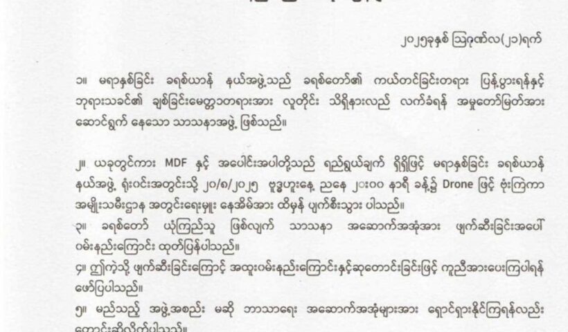 View More MRO/CDF-Matupi ၏ လူငယ်များ စစ်မှုထမ်းရန် ဖမ်းဆီးမှု ရှုံံ့ချကြောင်း မတူပီမြို့နယ်ပြည်သူ့အုပ်ချုပ်ရေး ထုတ်ပြန်မရာဒေသ မရာနှစ်ခြင်းခရစ်ယာန်နယ်အဖွဲ့ရုံးဝင်းကို MDF နှင့် အပေါင်းအပါများ ဒရုန်းဖြင့် ဗုံးကြဲတိုက်ခိုက်
