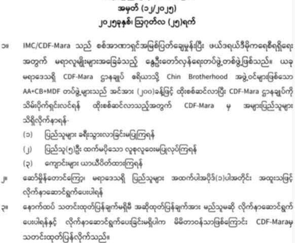 View More Weekly Summary News 25MRO/CDF-Matupi ၏ လူငယ်များ စစ်မှုထမ်းရန် ဖမ်းဆီးမှု ရှုံံ့ချကြောင်း မတူပီမြို့နယ်ပြည်သူ့အုပ်ချုပ်ရေး ထုတ်ပြန်