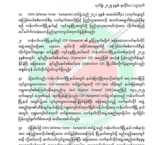 View More CDF-Mindat က ဖမ်းဆီးခဲ့သည့် CNF ဗဟိုစည်းရုံးရေးမှူး ပြန်လည်လွတ်မြောက်လာကန်ပက်လက်မြို့နယ်အတွင်းကျူးကျော်ဝင်ရောက် တပ်စွဲထားသော လက်နက်ကိုင် အဖွဲ့အစည်းများ ရှိပါက ချက်ချင်းပြန်လည်ရုပ်သိမ်းပေးရန် CDF-Kanpetle ထုတ်ပြန်