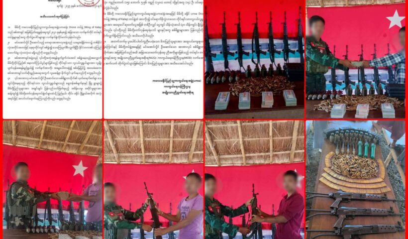 ကလေးခရိုင် (ပကဖ) ဒရုန်းတပ်ဖွဲ့ (Wing of Kalay) ထံ စစ်မှုထမ်းပေါ်တာဆွဲခံခဲ့ရသည့် တပ်သား ၁၄ ဦး လက်နက်ခဲယမ်းများနှင့်အတူ အလင်းဝင် စက်တင်ဘာလ ၁၇ ရက် ၂၀၂၅၊၊ စစ်ကိုင်းတိုင်း၊ ကလေးမြို့နယ်တွင် ကလေးခရိုင်ပြည်သူ့ကာကွယ်ရေးအဖွဲ့(ပကဖ)၊ ဒရုန်းတပ်ဖွဲ့ (Wing of Kalay) တပ်ဖွဲ့…