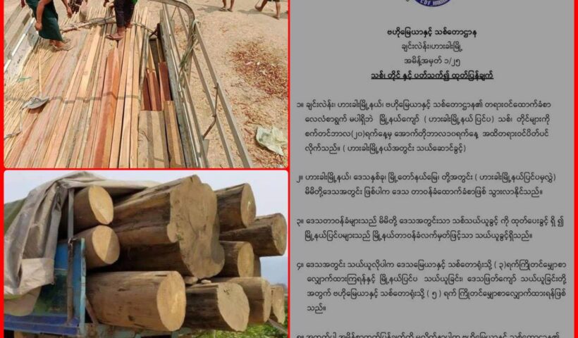 သစ်၊ တိုင်များ သယ်ဆောင်ခွင့်ကို ဗဟိုမြေယာနှင့် သစ်တောဌာန၏ တရားဝင်ထောက်ခံစာဖြင့်သာ သယ်ယူခွင့်ပြုမည်ဖြစ်ကြောင်း CDF-Hakha ထုတ်ပြန် စက်တင်ဘာလ ၁၉ ရက်၊ ၂၀၂၅။ ချင်းပြည်၊ ဟားခါးမြို့နယ်ပြင်ပနှင့် ဟားခါးမြို့နယ်အတွင်း သစ်၊ တိုင်များ သယ်ယူခွင့်ကို ဗဟိုမြေယာနှင့် သစ်တောဌာန၏ သက်ဆိုင်ရာမှ တရားဝင်ထောက်ခံစာဖြင့်သာ သယ်ယူခွင့်ပြုကြောင်း CDF-Hakha…